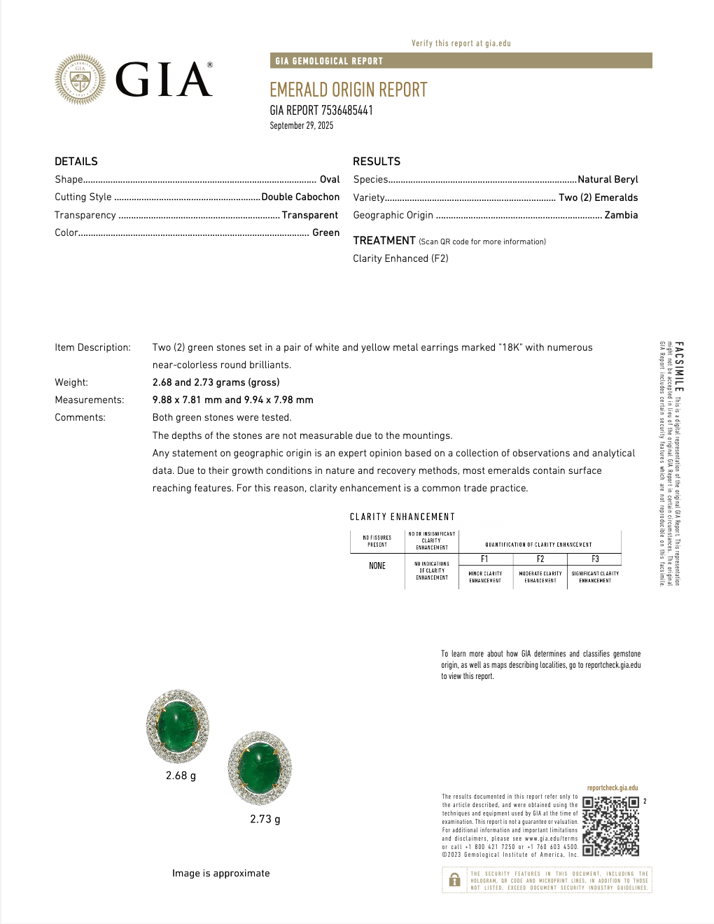 Accompanied by a GIA stating the emeralds are natural, Green colour, Zambia origin, with moderate clarity enhancement.