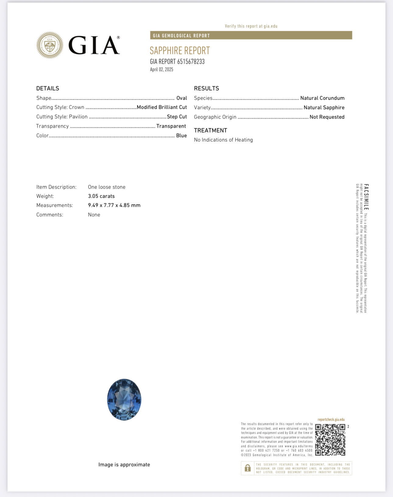 Accompanied by a GIA Certificate stating the blue sapphire is 3.05 carats and is unheated
