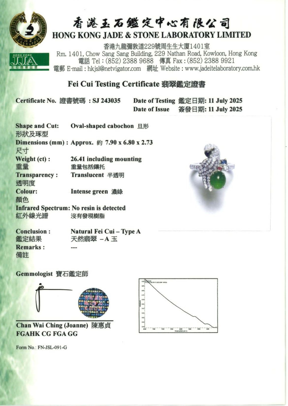 Accompanied by a Hong Kong Jade & Stone Laboratory certificate stating the jadeite is natural, known in the trade as "A Jade".