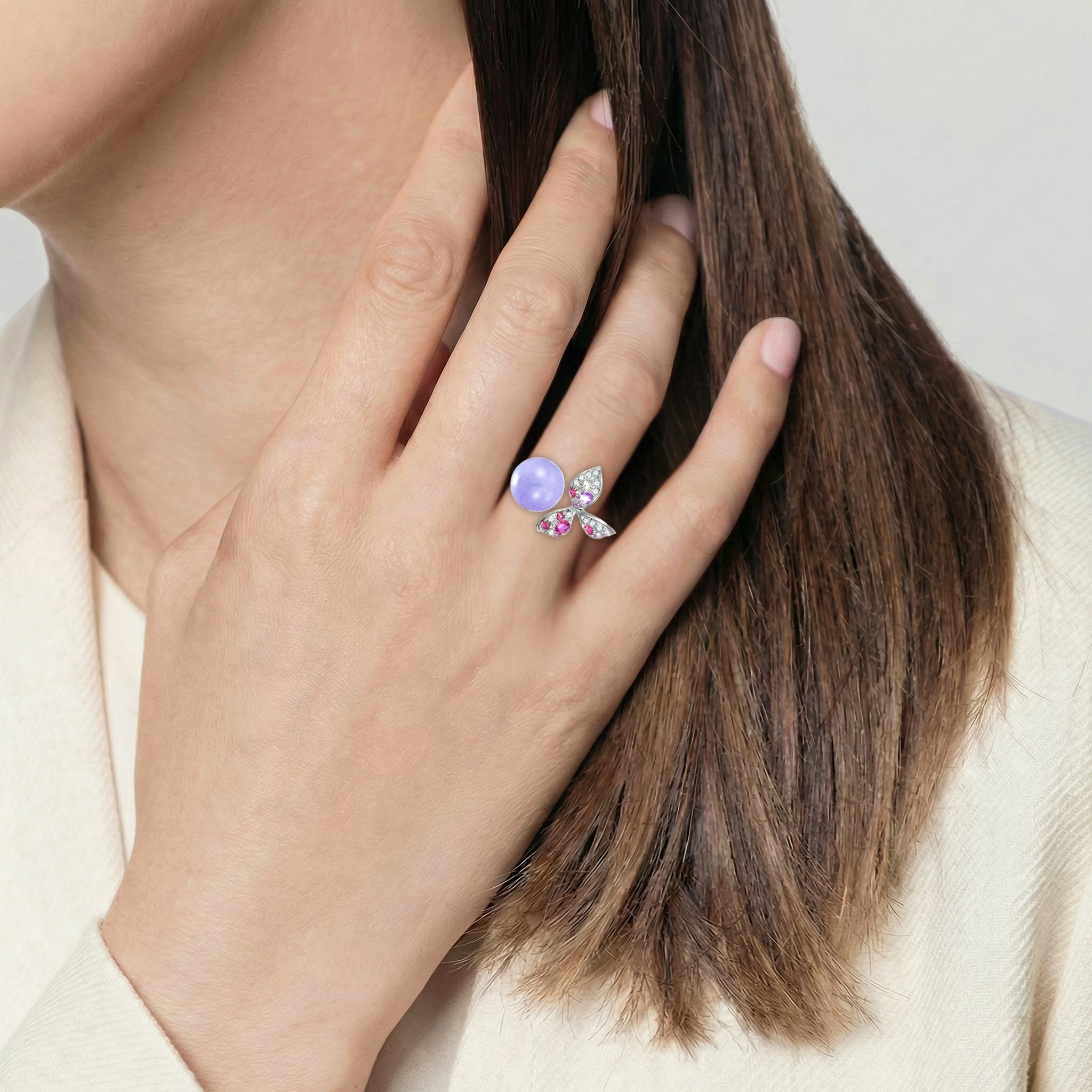 A rare harmony of hues defines this exquisite ring, centering on a lavender jadeite prized for its serene translucency and soothing pastel glow. Accents of vivid rubies infuse the piece with warmth and vitality, their purple and pink tones forming a striking contrast to the jadeite’s ethereal lilac.