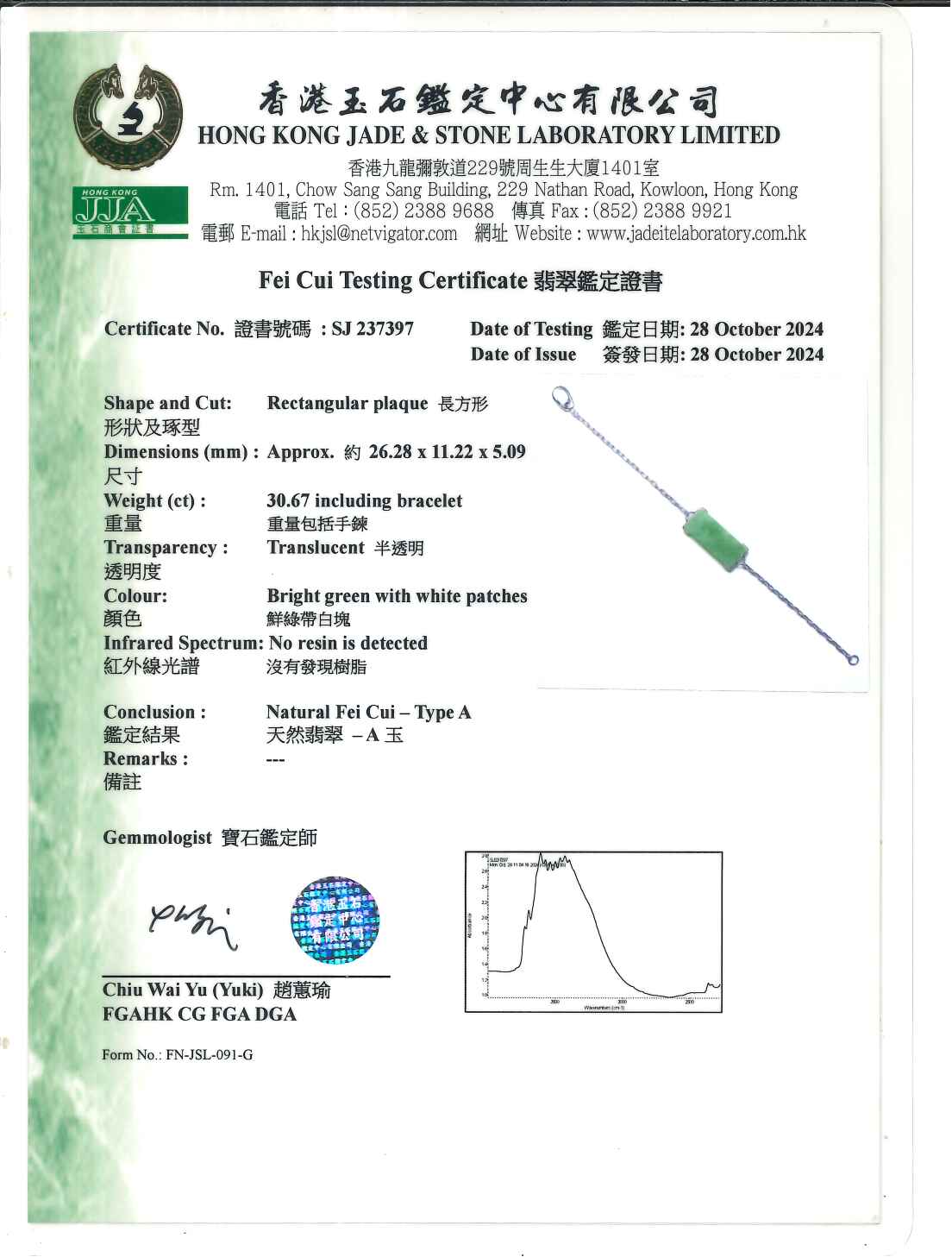 Accompanied by Hong Kong Jade & Stone Laboratory certificate, stating that the jadeite tested is natural, known in the trade as "A Jade."