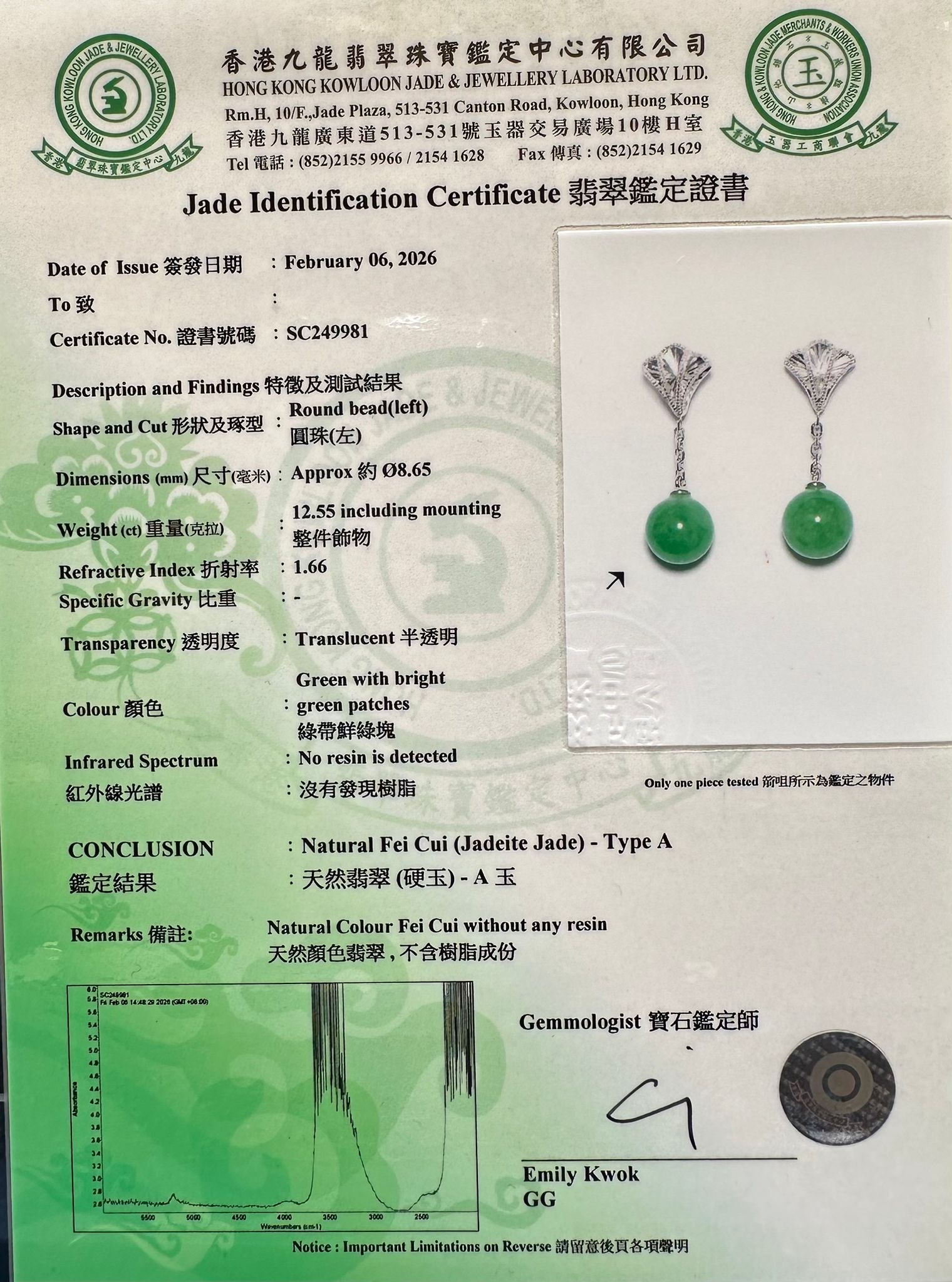 Accompanied by Hong Kong Kowloon Jade & Jewellery Laboratory LTD Certificate, stating that the jadeite is natural, known in the trade as ‘A Jade’.
