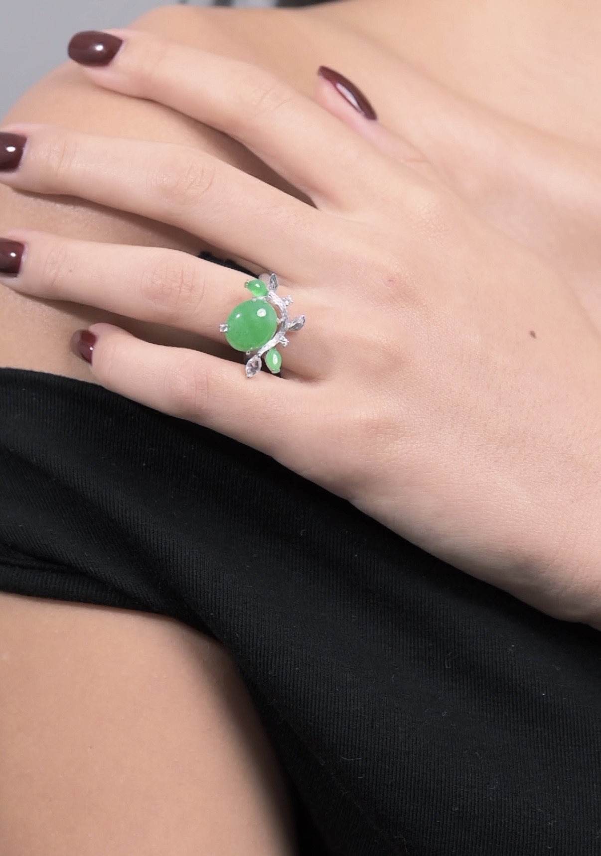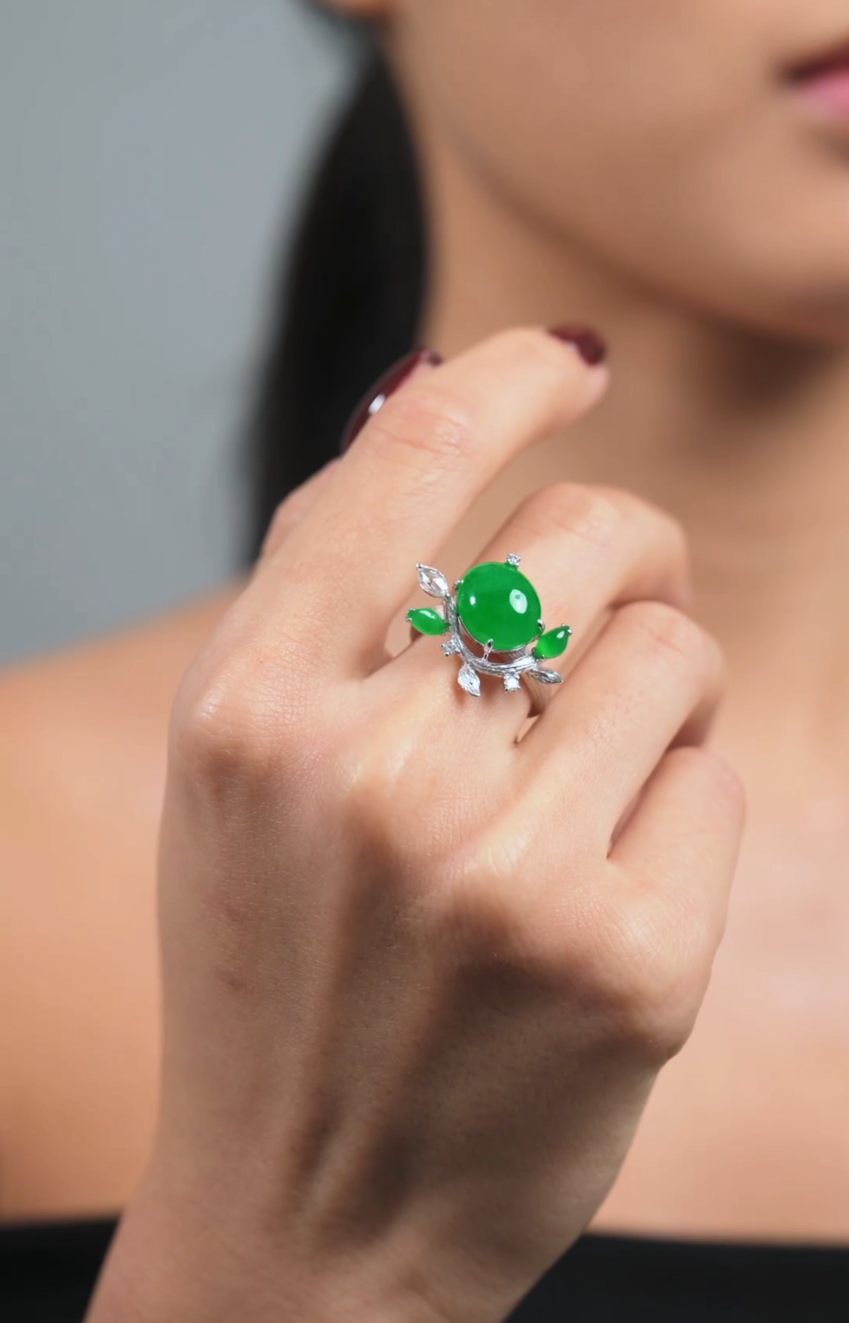 A celebration of grace and enduring beauty, the Rose Collection Jadeite and Diamond Ring showcases jadeite’s timeless allure framed by the brilliance of diamonds. At its center rests a finely polished jadeite gem, reverberating with natural vitality and a luminous glow that has long symbolized prosperity and harmony.
