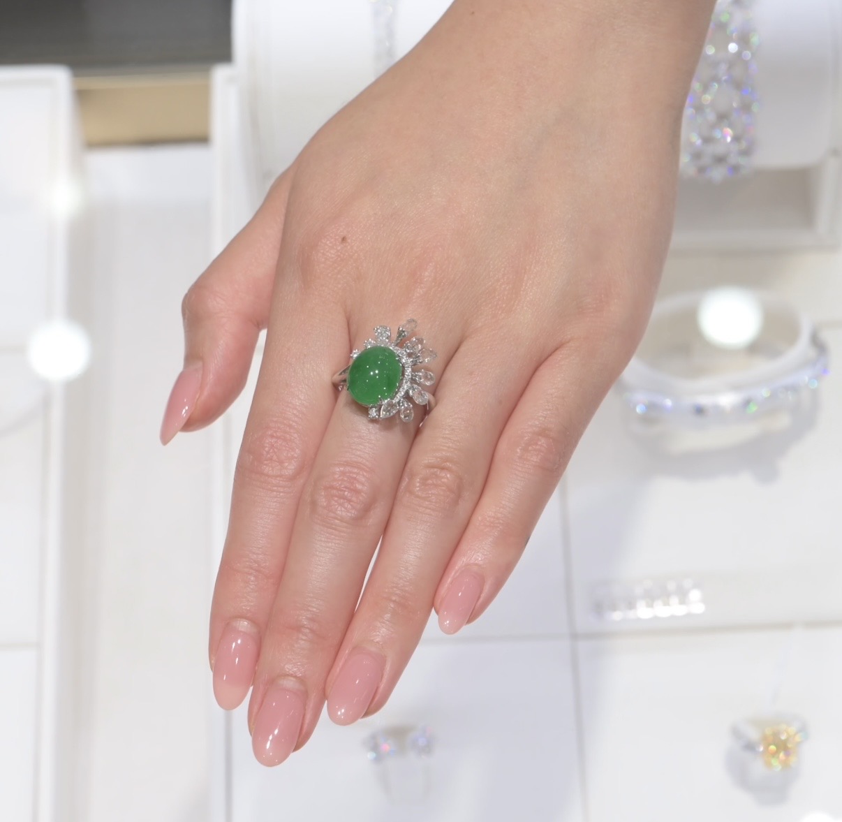 18K White Gold, Jadeite Cabochon, Rose Cut Diamond, Diamond